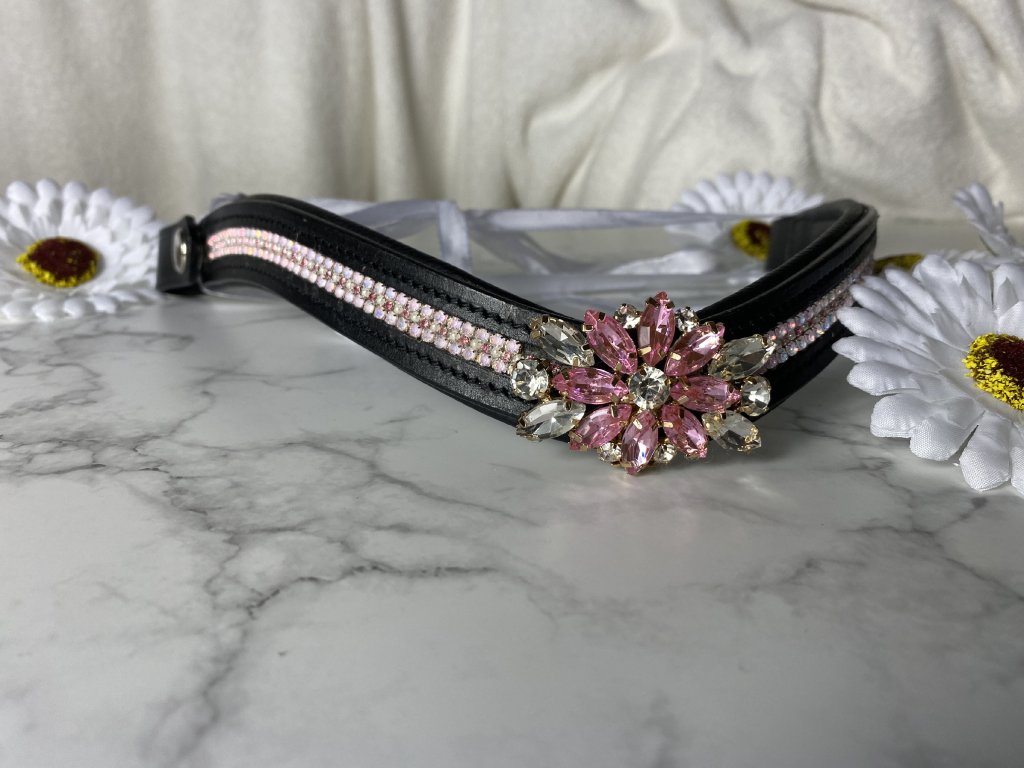 Flora is a unique, handcrafted browband adorned with decorative crystals and a luxurious central ornament that gives it a distinctive character and striking elegance.