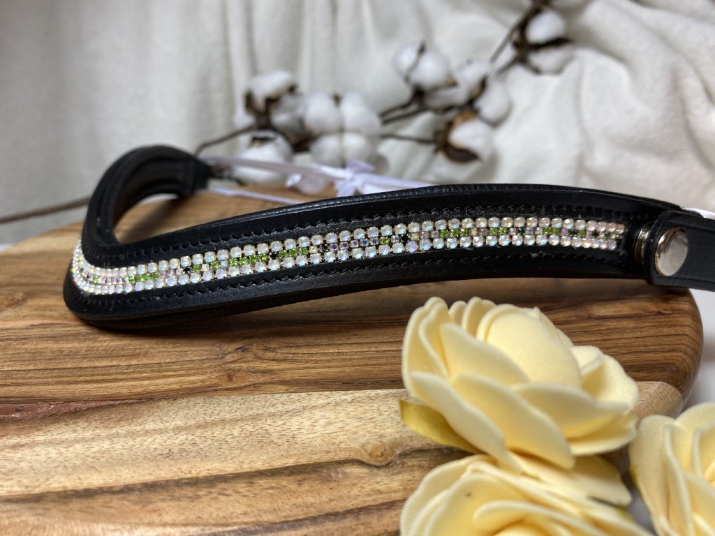 Lolli Pop is a unique, handcrafted browband adorned with decorative crystals in various colors for a playful and interesting look.
