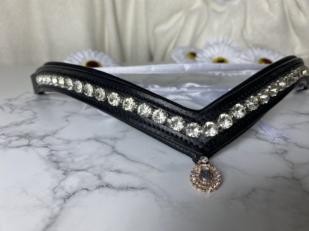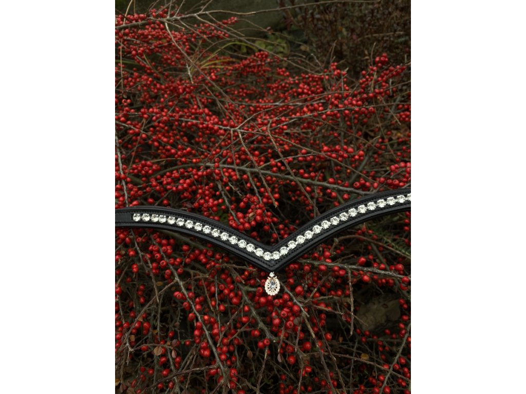 Lumina is a unique, handcrafted browband adorned with decorative crystals and a luxurious central ornament that gives it a distinctive character and soft elegance.
